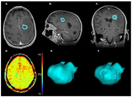 Example of whole-tumor segmentation for a high-grade glioma (HGG), with corresponding 3D rendering. (A–C) T1-MPRAGE Gd-enhanced axial/sagittal/coronal plane. (D) APTw image showing hotspots of increased APTw% signal from −5 to +5%. (E) 3D rendering of entire segmentation. (F) 3D rendering of entire segmentation with depiction of excluded central necrotic, cystic, or hemorrhagic areas.