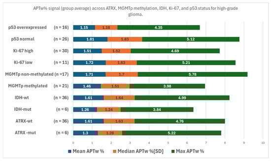 Composite graph showing the mean, median, and max APTw% signal for the different expressions of molecular markers (ATRX-mut, ATRX-wt, IDH-mut, IDH-wt, MGMTp non-methylated, MGMTp methylated, Ki-67 low, Ki-67 high, and normal or overexpressed p53). HGGs stratified over molecular status were not found to be statistically significant for mean, median, and max APTw% signal: ATRX: p-values = 0.3, 0.3, and 0.3; IDH: p-values = 0.3, 0.2, and 0.5; and Ki-67 index: p-values = 0.1, 0.3, and 0.6, respectively (Table S5).