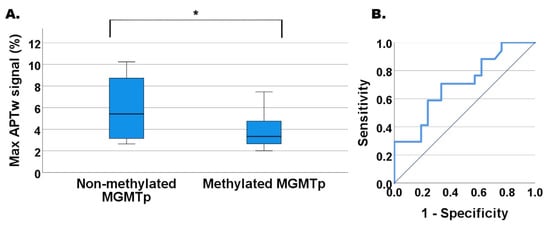 However, we observed that when analyzing the whole cohort of 42 HGG, also including the six cases of IDH-mutated tumors, the non-methylated MGMTp HGGs had significantly higher max APTw% signals compared to the methylated MGMTp HGGs within the entire segmented enhancing solid part of the lesion (Figure 3A). Similarly to our findings in Figure 3B, Jiang et al. [] showed, in a smaller cohort, a finding where the 90th percentile APTw% signal had the best discriminatory capacity with AUC = 0.856 for eight MGMTp non-methylated vs. eleven methylated GBMs []. However, they did not account for ATRX/IDH status or Ki-67 index, which may impact the interpretation of the results due to inferred bias.
