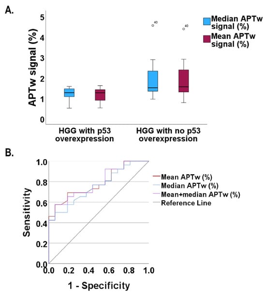 APTw% signals for high-grade glioma with and without overexpressed p53. (A) Clustered boxplots showing the distribution of mean APTw% signal and median APTw% signal. APTw% signal was reduced in HGG with an overexpressed p53. (B) ROC curves. AUC = 0.786/0.757/0.788 for mean/median/mean + median APTw% signals, with MW-U test p-values = 0.002/0.006/0.002, respectively. See Table 3 for corresponding sensitivities, specificities, and 95% CI. HGGs with normal p53, n = 26, and HGG with overexpressed p53, n = 16. Hanley–McNeil test yielded an AUC difference of 0.029 with a standard error of 0.1016, z = 0.2855, and p-value 0.78 between mean and median APTw (%) ROC curve metrics. This indicates no statistically significant differences in ROC performance between the two groups. Number 40 and circles pertain to patient 40 being an outlier for mean and median APTw% signals.