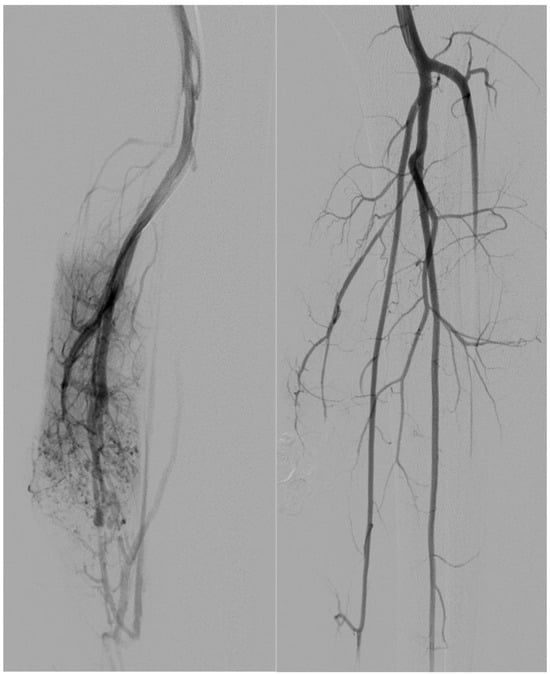A 17-year-old patient. Type I AVM from the collateral branch of the peroneal artery. The left image shows an angiographic examination performed pre-procedure. The right image shows post-embolization angiography performed with a Progreat microcatheter and injecting EVOH particles alone.