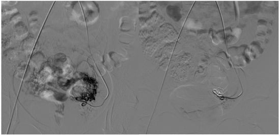 A 33-year-old patient presents with a Type I AVM from the collateral branch of the uterine artery. The left image shows an angiographic examination performed pre-procedure after super-selective catheterization of the vessel using an RUC catheter and a Progreat microcatheter. The image on the right shows post-embolization angiography performed using three 6 mm Nester coils and injecting EVOH.