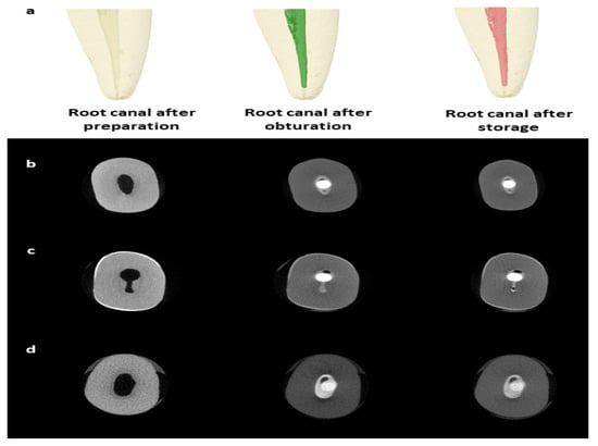 A high-resolution micro-CT system (SkyScan 1172; Bruker-microCT, Kontich, Belgium) was used with a source voltage of 89 kV, source current of 112 µA, and 5.9 s exposure time using a 360° rotational angle with a 0.6° rotational step. Raw images in Tagged Image File Format (TIFF) were produced with a pixel size of 13.73 µm and a frame averaging of two. The images were reconstructed using NRecon software (version 1.6.4.8, Skyscan, Bruker-microCT, Kontich, Belgium) from a total of 1333 slices. The reconstructed images were processed using a Gaussian kernel and ring artifact correction of 6 with 20% beam hardening correction. A standard binarization process was applied to identify and measure the voids volume, with any area falling below the threshold value of 96. This value was selected after evaluating different values and found to be the most suitable to differentiate between the root filling, dentin, and space. The micro-CT images of the teeth were obtained and reconstructed after canal preparation, post-obturation, and after 8-week storage in a phosphate-rich solution (Figure 1).
