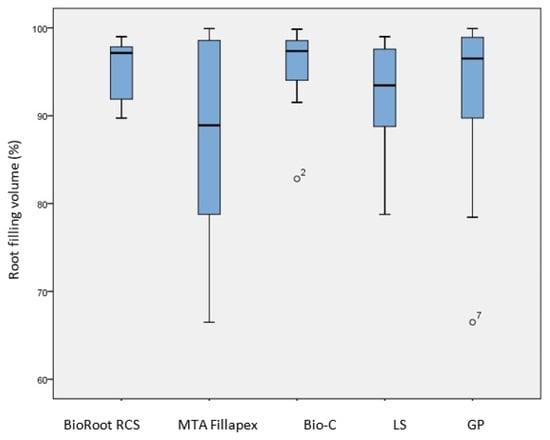 The average percentage for all the sealers was (92.94% ± 7.98). The highest percentage was achieved by BioRoot RCS (95.61% ± 3.46), followed by Bio-C Sealer (95.32% ± 5.14) and MTA Fillapex (87.87% ± 11.13). Although there were mean differences between the sealers, the Kruskal–Wallis test showed no statistically significant differences (p = 0.325). Comparing the percentage of root filling volume between the two sealer application methods (Figure 2), it was slightly higher when the LS was used. However, no statistically significant difference was found based on the Mann–Whitney U test (p = 0.950).
