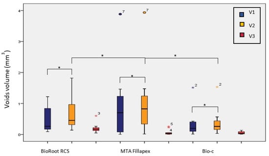 In all the sealers, the voids volume was significantly higher after storage (V2) (p < 0.05) based on the Wilcoxon signed-rank test (Figure 3).