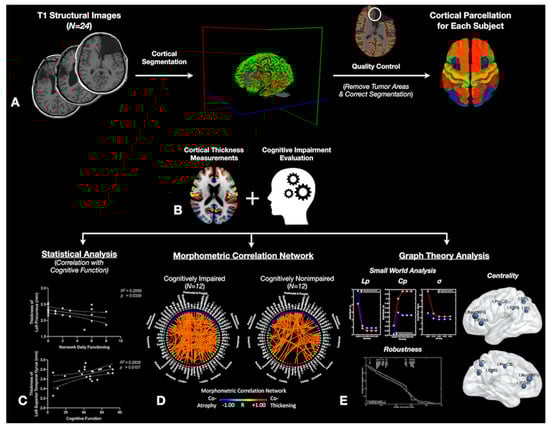 Image processing and analysis pipeline. (A) T1 structural images were processed using Freesurfer, followed by quality control to ensure no cortical segmentation errors. (B) After extracting the cortical thickness of each participant, this information was combined with cognitive impairment information. From there, (C) statistical analyses, including Pearson’s correlation analysis, were performed to find associations between regional cortical thickness and functional outcomes. (D) Cortical thickness was also used to construct the morphometric correlation network (MCN). (E) In-house Matlab scripts incorporating the Graph Theory GLM tool to analyze the MCN properties, including small-world analysis, centrality, and robustness. Full presentation of the findings in (C–E) are presented in the Results section.