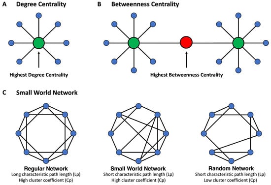 In-house Matlab scripts incorporating the Graph Theory GLM tool (www.nitrc.org/projects/metalab_gtg) (accessed on 20 March 2019), were used to calculate and analyze the MCN properties as well as to compute region-weighted network centrality metrics (Figure 1E). In graph theory and network analyses, indicators of centrality identify the predominant nodes within a graph or a whole network [,]. The current study mainly focused on two indices of centrality metrics: (1) degree centrality, which reflects the number of neighbors a brain region interacts with (Figure 2A, see detailed information and mathematical formula in Supplementary Methods); and (2) betweenness centrality, which reflects the ability of a region to influence information flow between two other regions (Figure 2B, see detailed information and mathematical formula in Supplementary Methods). Nodes with both high degree centrality and high betweenness centrality are considered to be predominant nodes [,]. Additionally, small-world architecture, which ensures both the efficiency of specialization and the integration of distributed networks [,,], was characterized by computing the cluster coefficient (Cp) and the characteristic path length (Lp) (Figure 2C, see detailed information and mathematical formula in Supplementary Methods) [].