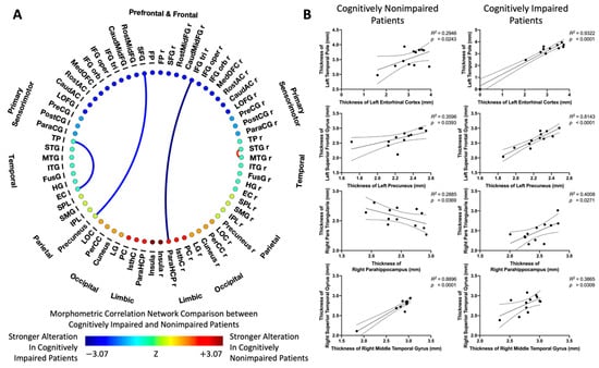 (A) Comparison of morphometric correlation networks (MCNs) between cognitively impaired and non-impaired patients. Colors denote values of the Z-statistic; yellow–red represents a stronger alteration in cognitively non-impaired patients; cyan–blue denotes stronger alteration in cognitively impaired patients. (B) Representative interregional correlations in cognitively non-impaired and impaired patients.