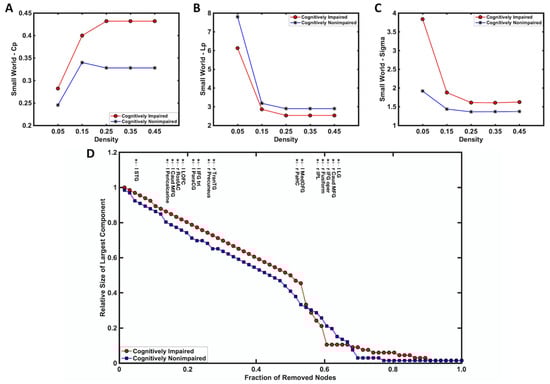 The small-world organization of brain networks was quantified for both cognitively non-impaired and impaired patients (Figure 4). Compared to cognitively impaired patients, non-impaired patients had a smaller cluster coefficient (Cp; Figure 4A) and a longer characteristic path length (Lp; Figure 4B) over a wide range of density, resulting in the cognitively impaired patients having a larger small-world index (Sigma; Figure 4C). In order to assess the network robustness of both cognitively non-impaired and impaired patients in response to the removal of targeted nodes, changes in the size of the remaining largest component of the network were plotted as a function of fractions of removing nodes in descending order of nodal betweenness centrality (Figure 4D). Compared to the cognitively non-impaired group, the cognitively impaired group showed more network tolerance when removing a small fraction of targeted nodes, but robustness was significantly reduced (p < 0.05) when the fraction of removed nodes exceeded 0.55.