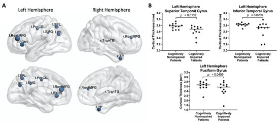 Cognitively non-impaired and impaired patients shared some common predominant nodes with high centrality (Figure 5A), located at the left precentral gyrus (l PreCG), left supramarginal gyrus (l SMG), left superior parietal lobule (l SPL), left inferior parietal lobule (l IPL), left pars triangularis (l IFGtri), right transverse temporal gyrus (r TranTG), right temporal pole (r TP), and bilateral rostral middle frontal gyrus (RostMFG). When compared to cognitively impaired patients (Figure 5B), the cognitively non-impaired patients were observed to have thicker gray matter in the left superior temporal gyrus (l STG, p = 0.0132), left inferior temporal gyrus (l ITG, p = 0.0132), and the left fusiform gyrus (p = 0.0409).