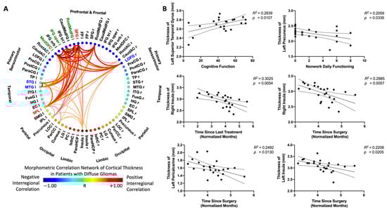 (A) Analysis of morphometric correlation networks (MCNs) of cortical thickness in patients with diffuse gliomas. Red–yellow denotes positive interregional correlation, while blue–light blue denotes negative interregional correlation. Green highlighted labels indicate nodes with high degree centrality, blue highlighted labels indicate nodes with high betweenness centrality, and red highlighted labels indicate nodes with both high degree and betweenness centrality. (B) Representative correlations between cortical thickness and cognitive function, between cortical thickness and non-work daily functioning, and cortical thickness and time since surgery in patients with diffuse gliomas.