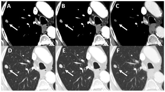 In practice, CT image quality should comply with the clinical requirements. While reduced image quality may be sufficient for chest-CT screening, oncologic CT often requires high-diagnostic image quality to ensure the accurate detection of even subtle abnormalities. Despite previous reports recommending low-energy or even ultra-low-dose energy protocols for diagnosing pneumonia, lung nodules, and fibrosis [,], a meta-analysis evaluating the accuracy of low-dose-CT found widely varying accuracies that prevented deriving unified performance data []. Some reports indicated adequate detection accuracy of honeycombing and bronchiectasis with low-dose CT, as well as the adequacy of ultra-low-dose-CT for diagnosing pneumothorax, consolidations, and ground-glass opacities. Others have stated that low-dose chest-CT protocols are potentially beneficial in certain clinical settings but not in obese patients or with atypical interstitial lung diseases []. In contrast, oncologic chest-CT has a wide spectrum of abnormalities and complex clinical questions, including tumor monitoring, the detection of new metastases, the assessment of potential drug toxicity-induced pulmonary complications, and paraneoplastic coagulation disorders with aortic or pulmonary vascular thrombosis for which adequate image quality is a requisite for accurate diagnoses.
