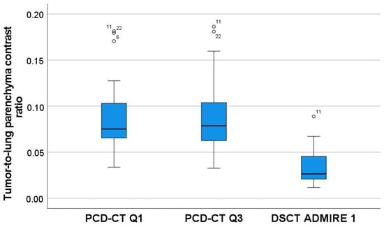 Similarly, the visual reader assessment of image contrast and noise were best for PCD-CT in all tissues, but the differences to DSCT proved not significant. Moreover, the mediastinal noise levels were significantly lower for PCD-CT Q1 and Q3 strengths compared to DSCT. The image contrast was better for PCD-CT, even for the Q1 strength, than DSCT. For lung parenchyma, the image contrast and quality were significantly better for both Q1 and Q3 strengths. Finally, the tumor-to-lung parenchyma contrast ratio proved superior for the PCD over the EID.
