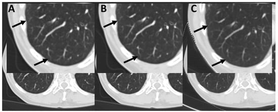 Delineation of lung vessel contours in a 59-year-old man. Window width: 1000 HU, Window level: −590 HU, (A) Q1 iterative reconstructed image data set, (B) Q3 iterative reconstructed image data set, (C) ADMIRE1 iterative reconstructed image data set. Arrows: bifurcation of thin vessels.