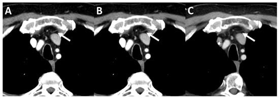 PCD-CT was performed with the patients in the supine position using a first-generation dual-source CT scanner with quantum imaging (NAEOTOM Alpha, Siemens Healthineers, Forchheim, Germany) equipped with two photon-counting detectors. The polychromatic images were reconstructed for PCD-CT at 120 keV—so-called T3D— representing polychromatic information that can be considered comparable to a conventional polychromatic reconstruction on a DSCT scanner []. The following examinational protocol was used: 120 kV (automated tube current modulation—CareDose 4D), mean X-ray tube current 110 mAs, IQ level 60, a slice thickness of 3 mm, focal spot 0.8/1.2, kernel Br40f, iterative reconstruction factor Q1 and Q3, single collimation with a width of 0.4 mm, total collimation with a width of 57.6 mm, a table speed of 115.2 cm/s, a table feed/rotation of 57.6, and a spiral pitch factor of 1. The contrast agent protocol was standardized for all of the patients and was identical to the DSCT protocol.