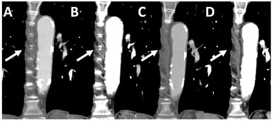 Coronal reformats of a contrast-enhanced chest-CT in a 76-year-old female patient. Note the different quality in delineation of intercostal vessels. (A,C): Window width: 877 HU, Window level: 108 HU, (B,D): Window width: 342 HU, Window level: 56 HU, (A,B) Q1 iterative reconstructed image data set, (C,D) ADMIRE1 iterative reconstructed image data set. Arrows: thin intercostal vessels.
