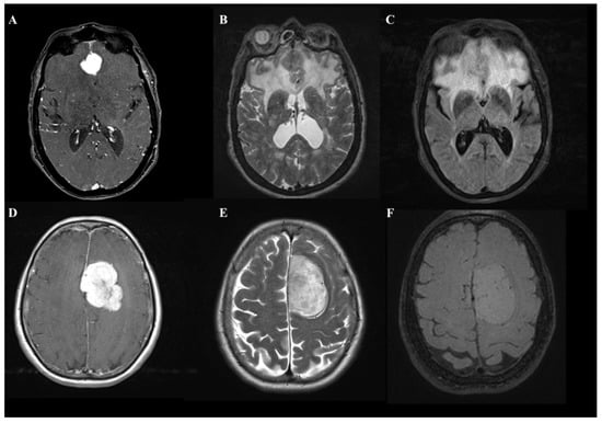 Meningiomas are benign neoplasms arising from meningoendothelial cells [1]. They are the most frequent intracranial tumor in the adult population. Although intracranial meningiomas (IM) are typical extra-axial tumors, the occurrence of peritumoral brain edemas (PBE) are not rare, affecting between 38% to 67% of IM patients [1,2,3]. It is well recognized that a large proportion of PBE can increase morbidity and mortality [2] and determine brain displacement, increase intracranial pressure [3], and add the risk of perioperative seizures [4]. In daily clinical practice, it is not uncommon for a neurosurgeon to confront the diagnosis of an IM with a large proportion of edema irrespective of the site and size of the contrast-enhancing lesion (Figure 1).