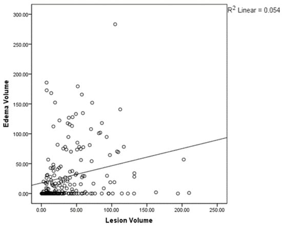 Pearson’s bivariate correlation plot demonstrating the presence of a positive correlation between the contrast-enhancing lesion volume and the edema volume as measured in T2-FLAIR (p < 0.01).