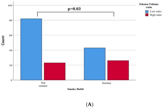 From a clinical perspective, the comparison between the two subgroups showed no significant differences in variables such as age (p = 0.15), sex (p = 1), and comorbidities (p = 0.32). Conversely, a history of smoking intake was more frequently associated with the group with a high rate of edema/tumor (p = 0.03, Figure 3A). The pathogenesis could be linked to a previously reported blood-brain barrier (see discussion below), although the written result should be interpreted cautiously as a statistical association.