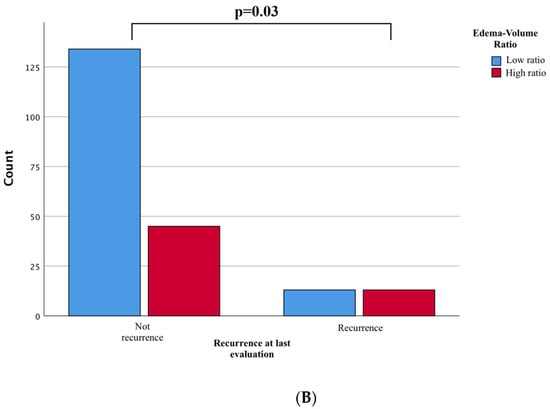 (A): Chi-square Comparison Analysis shows statistically significant differences in the smoking habit in subjects with a high edema-to-tumor volume ratio (p = 0.03). (B): significantly increased risk of developing recurrence independently compared with meningiomas with a low ratio (p = 0.03).