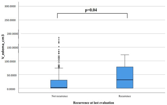 We obtained similar data by measuring the relationship between edema volume and risk of recurrence with t-student tests and found that IMs that presented more significant tumor edema at diagnosis were more likely to recur if compared to those that never recurred (42.3 cm3 vs. 26.62 cm3, p = 0.04, Figure 4).