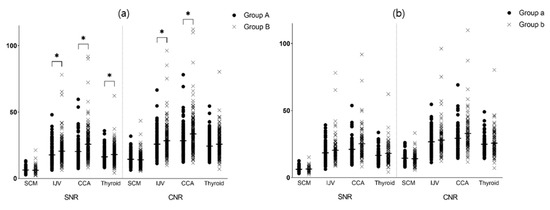 Differences in SNR and CNR between (a) Group A and B; and (b) Group a and b. * = p-value < 0.05, Student’s t-test.