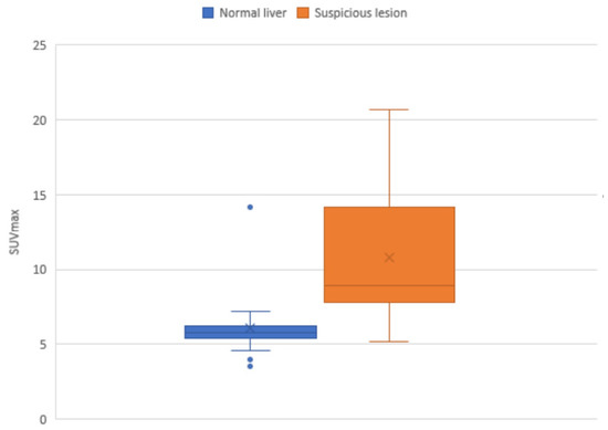 Interquartile SUVmax ranges for lesions considered suspicious based on PSMA, compared with average normal liver SUVmax. The blue dots are outliers.