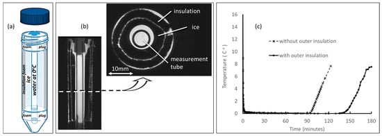 (a) Schematic of DWI phantom constructed from a 50 mL centrifuge tube designed to hold water in an 8 mm measurement tube at known temperature, thus with known diffusion coefficient. (b) Coronal and axial MRI with internal phantom components labeled. (c) Plot of measurement tube temperature versus time after measurement tube, initially at room temperature, is inserted into frozen phantom. Note, thermal equilibrium at ≈0 °C is achieved.