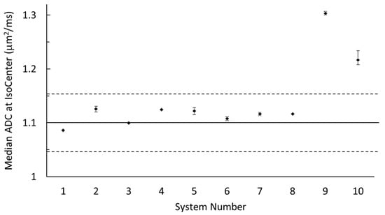 Median ADC measured at the isocenter of each system. Each data point is the median of all scans (up to 4) from each system, and error bars indicate the maximum and minimum (range of) isocenter ADC values. The solid line marks Dtrue (1.1 µm2/ms), and dashed lines are ±5% relative to Dtrue.