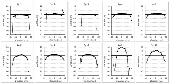 Figure 3 displays relative bias of each system as a function of location on the z-axis. All systems are displayed on the same scale to aid visual comparison. Again, the solid horizontal line represents 0% bias relative to Dtrue. Automatic rejection of unrealistic ADC values (<0.5 µm2/ms) only occurred outside |z-offset| > 20 mm. Most systems display the pattern of maximum ADC at isocenter, with lower ADC as |z-offset| distance increases, which is consistent with gradient nonlinearity patterns for horizontal bore gradients on human scanners. Systems 9 and 10 showed >10% bias for ADC at isocenter, while others had low isocenter bias (comparable to measurement error). These two systems also showed the greatest gradient nonlinearity over the central region, within ±15 mm of isocenter.