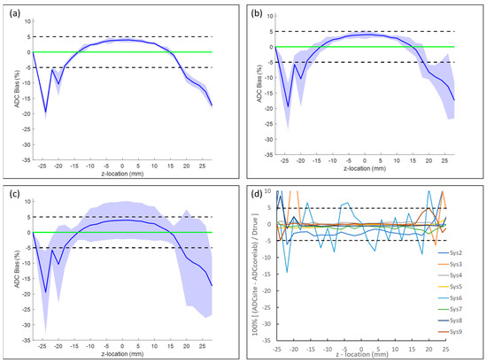 Summary of bias and repeatability for all studied systems: (a) mean bias (blue line) and short-term (intra-exam) repeatability relative to Dtrue, plotted as a function of z-axis location. Note, systems 8 and 9 did not provide short-term repeatability data (Table 1). (b) Corresponding plots for long-term (inter-exam) repeatability. Shaded regions in (a) and (b) represent bias ± 100% wSD/Dtrue. (c) Cross-system reproducibility, where shaded region represents bias ± 100% SD/Dtrue. Green line denotes ideal 0% bias. (d) Difference between site-generated and core-lab-generated ADC relative to Dtrue. Difference for core-lab systems 1 and 10 is zero (not plotted). Plots are on the same scale to aid visual comparison of bias, short- and long-term repeatability, reproducibility, and difference between site- versus core-lab ADC generation routines.