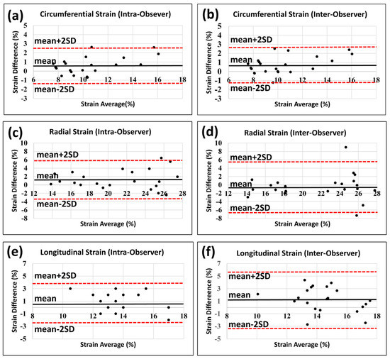 Bland-Altman plots show low intra- and inter-observer variabilities in strain measurements. Strain analysis was conducted twice by the same observer with >2 months between analyses to assess intra-observer variability and once by another observer to assess inter-observer variability. Intra-observer (a,c,e) and inter-observer (b,d,f) measurements for circumferential (a,b), radial (c,d), and longitudinal (e,f) strains show low variabilities. All measurement differences lay within the mean ± 2 SD range, except for one point in (c) and one point in (d) in the radial intra-observer and inter-observer measurements, respectively.