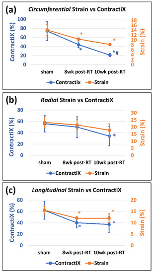 The ContractiX parameter significantly reduced post-RT in all directions, as shown in Table 1, Figure 4 and Figure 5, where the degree of reduction was most in the circumferential direction, followed by that in the longitudinal direction, and then in the radial direction. Nevertheless, the degree of reduction in ContractiX was always larger than that in strain in all directions, as shown in Figure 5. Note the capability of ContractiX not only for demonstrating significant differences between measurements at 8 weeks and 10 weeks post-RT compared to sham but also for significantly differentiating between measurements at 10 weeks post-RT compared to 8 weeks post-RT (Figure 4), showing its high sensitivity for detecting progression in cardiac dysfunction post-RT.