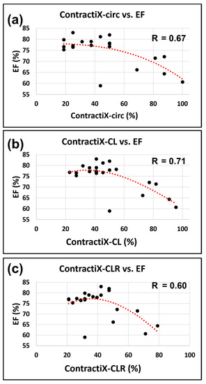 ContractiX shows a nonlinear relationship with LVEF. Scatter plots of ContractiX calculated from (a) circumferential (ContractiX-circ), (b) circumferential plus longitudinal (ContractiX-CL), and (c) circumferential plus longitudinal plus radial (ContractiX-CLR) strains versus ejection fraction (EF) in all scanned rats. While EF is ≥59% in all rats, ContractiX spans a wide range of measurements between 25% and 100%, and it shows a nonlinear inverse relationship with EF. The correlation coefficients (R) are shown in the figure, and the p-value was <0.05 for all cases (note the overlap of some points from different animals).