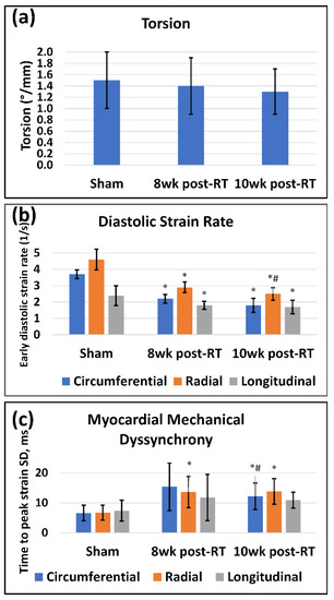 Besides strain, other heart contractility parameters also demonstrated worsening cardiac function post-RT (Table 1). Ventricular torsion (Figure 7a) showed a non-significant decrease post-RT compared to the sham rats. Diastolic cardiac function was affected post-RT (Figure 7b), where the early-diastolic strain rate significantly decreased in all directions at 8 weeks and 10 weeks post-RT compared to the sham rats. Furthermore, the radial diastolic strain rate significantly reduced at 10 weeks post-RT compared to 8 weeks post-RT. As might be expected after high-dose radiation to the heart, myocardial mechanical dyssynchrony increased post-RT (Table 1 and Figure 7c), where radial TTP significantly increased at 8 weeks post-RT compared to sham rats, while both circumferential and radial TTP significantly increased at 10 weeks pot-RT compared to sham rats. Furthermore, circumferential TTP significantly increased at 10 weeks post-RT compared to 8 weeks post-RT.