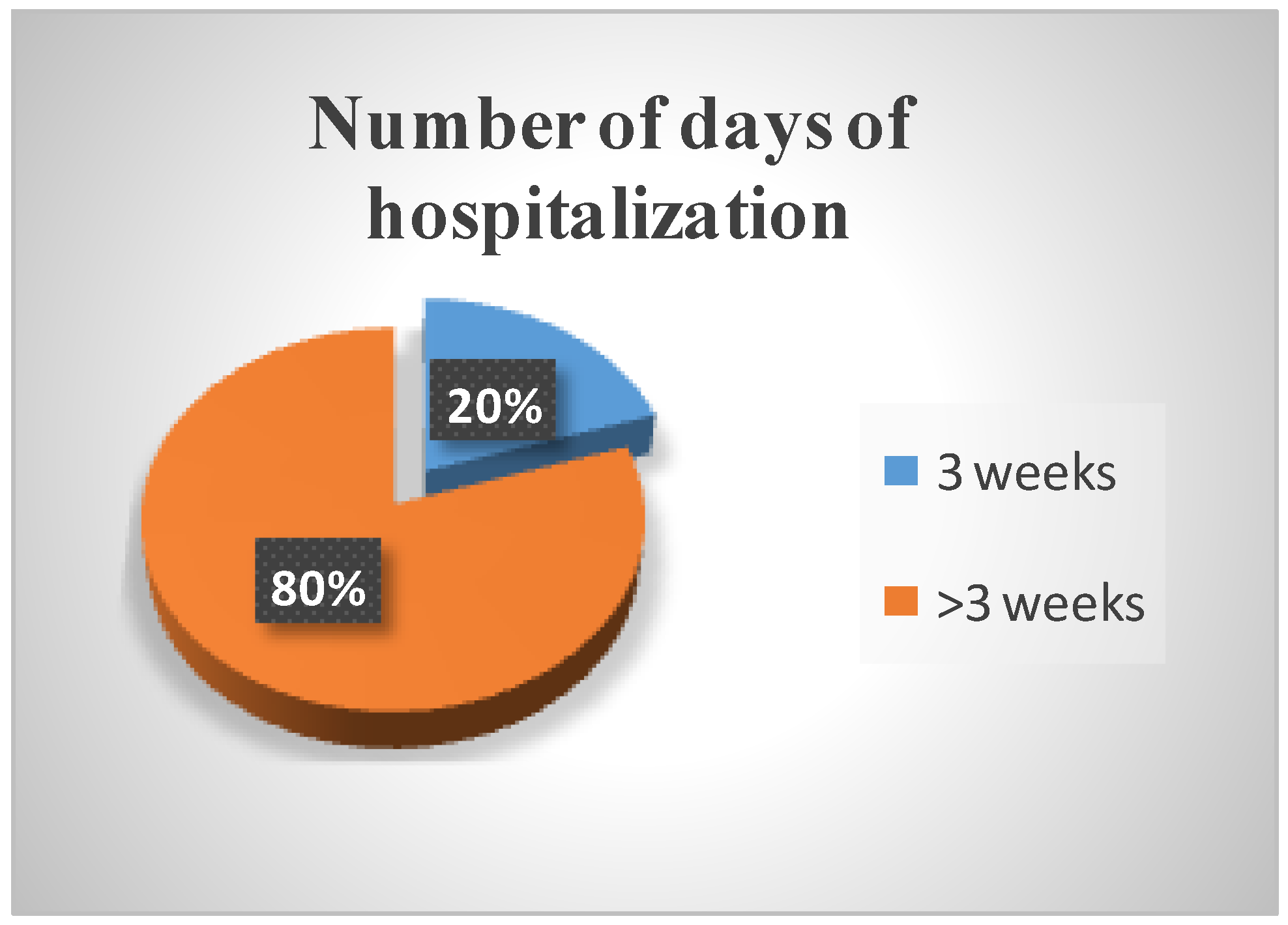To characterize the impact of pancreatic encephalopathy in acute pancreatitis on the number of days of hospitalization, the analyses were made by stratifying the hospital stay into 2categories, by weeks of stay: 3 and greater than 3 weeks. The majority of the study population had a greater than 3 weeks hospitalization (4 patients-80%), 1 patients (20%) requiring 3 weeks hospitalization (