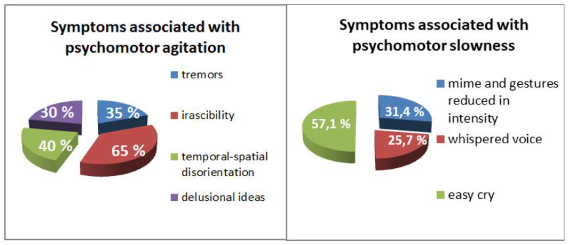 Symptoms associated with psychomotor agitation (left). Symptoms associated with psychomotor slowness (right).