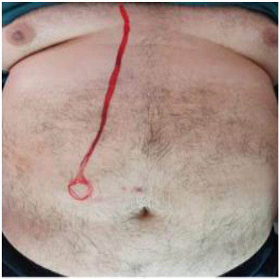 Soft-tissue ultrasound examination to identify the topography of the ventriculo-peritoneal shunt was performed with the patient positioned in anti-Trendelenburg at a 20° angle and slightly to the left, so that the skin marking corresponded to that in the operative position. Thus, the course and position of the ventriculo-peritoneal shunt (Figure 2) were traced by skin marking to guide us where the supraumbilical incision trocar for the Veress needle and the first (the subxiphoid) working trocar, should be inserted.