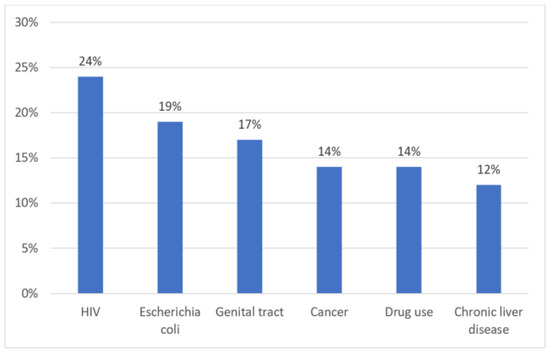 Thus, the largest proportion of this maternal risk (24%) is found in patients with the human immunodeficiency virus (HIV), 29% in patients with Escherichia coli, 17% in patients with genital tract infection, 14% in patients with cancer, 14 % in the case of drug users, and 12% in the case of patients with chronic liver disease (Figure 2).