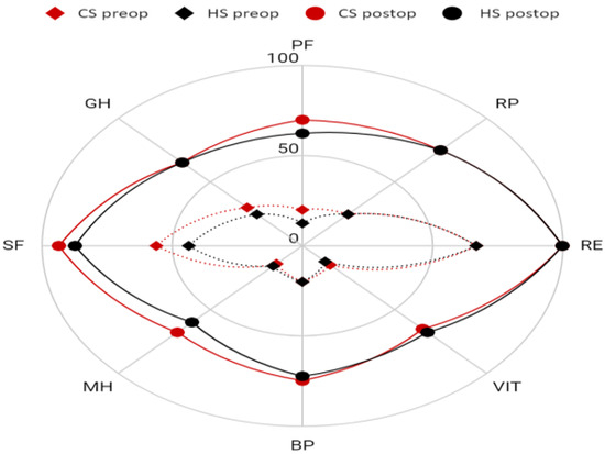 The preoperative QoL in the BP category (p < 0.01) and the SF category (p = 0.03) was statistically significantly worse for the HS group. This lower QoL in the SF domain also extended into the postoperative phase (p < 0.01). There were no other significant differences observed, as presented in the Table 3.