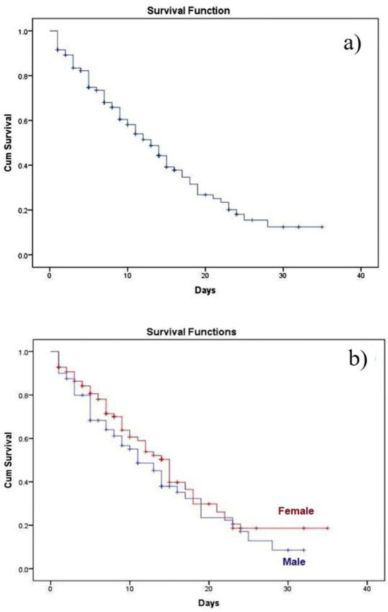 While the hospitalization time was between 1-35 days (average 9.66±7.33 days), we noticed 42.94% survival after 35 days, significantly higher in females compared to males (50.52% vs 33.75%). The average survival time was 8.66 days, insignificantly lower for females compared to males (8.54 days vs 8.77 days, p=0.861), as can be seen in Figure 1 (a, b), while means and medians for survival time are presented in Table 5, along with the calculated confidence interval.