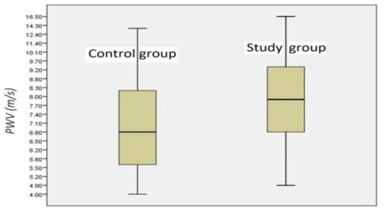 The mean pulse wave velocity value in patients from the study group was 8.3±2.3 m/s. This value was higher than in the control group, 7.2±2.3 m/s (p=0.0039) (Table 2, Figure 1).