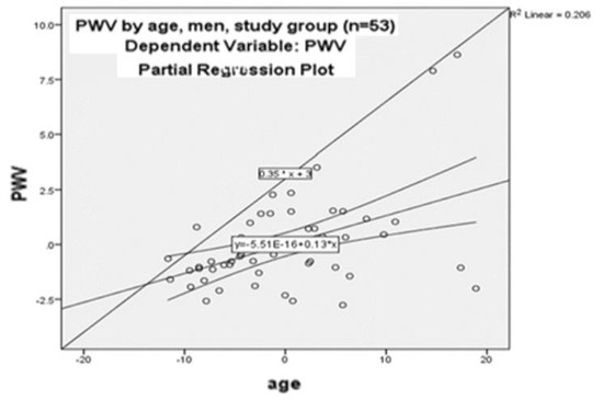 Partial regression plot: ft-PWV and age T2DM group (men, n=53).