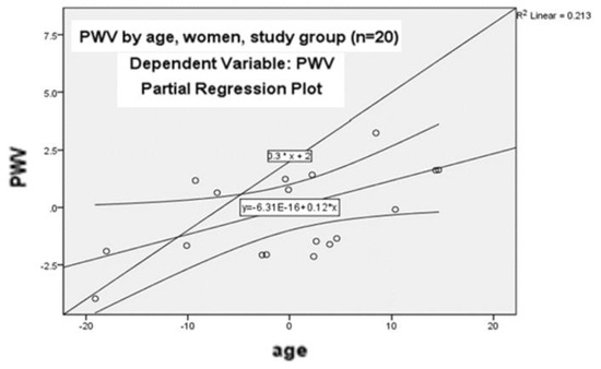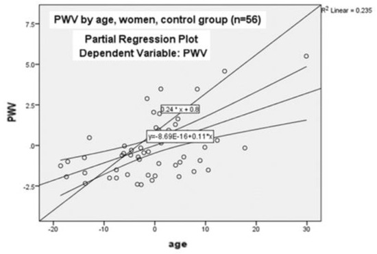 Partial regression plot between ft-PWV and age in non T2DM (women, n=56).
