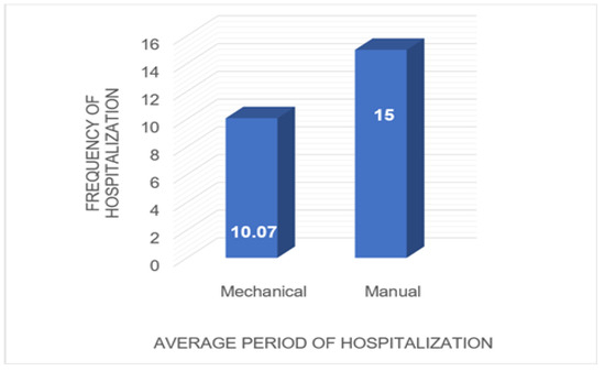 Distribution of patients according to type of anastomosis and length of hospitalization. Of the 54 patients who underwent mechanical anastomosis for rectal cancer, an average hospital stay of 10 days was registered in this study. At opposite end, for the 16 patients who underwent manual anastomosis for rectal cancer, the average length of hospitalization was approximately 15 days (Table 7, Figure 3).