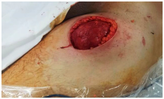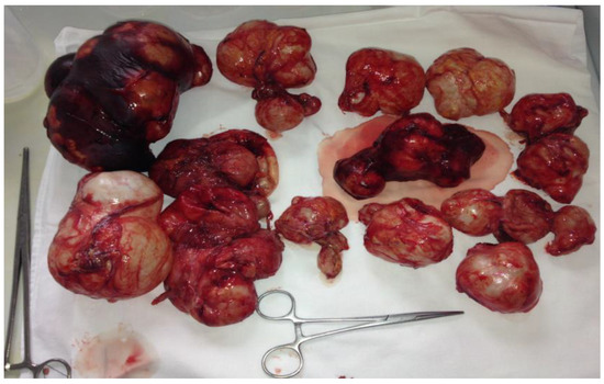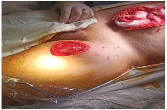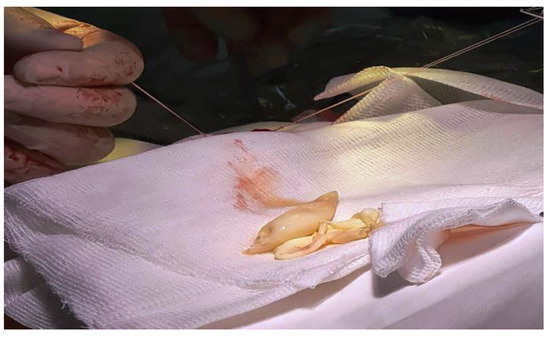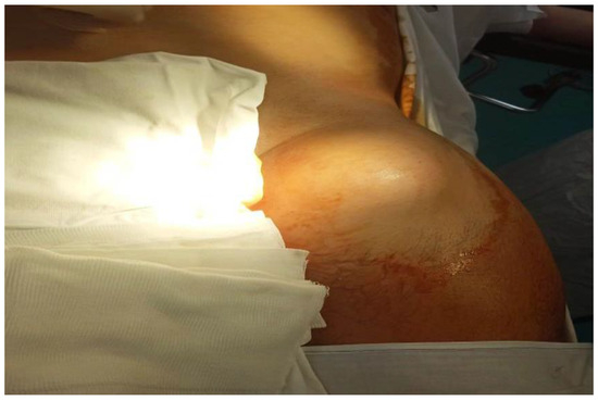 The abdominal approach was performed through median pubosupraumbilical laparotomy (Figure 13). The left paramedian retroperitoneum was exposed by taking off the sigmoid colon and isolating the spermatic pedicle and the left ureter. The intraoperative evaluation of the lesion reveals: a polylobate tumor formation that occupies the left paramedian retroperitoneum, below the bifurcation of the renal artery and passes under the inguinal arch through the muscular and vascular gap at the level of the hip. The dissection of the tissue pericyst is very difficult, and when the cyst is opened, after isolating the peritoneal cavity, multiple germinal membranes and a large amount of clear liquid are discharged. The opening of the cyst in the sloping portion (from the level of the pelvis) ensured the evacuation of germinal membranes and small vesicles after performing an effective lavage through the upper pole of the cyst (located intraabdominally) (Figure 14, Figure 15 and Figure 16). The digital exploration of the outstanding cavity finds the retroperitoneal mutisaccular development, the communication through the muscular and vascular lacuna with a similar cavity located at the base of the left thigh.