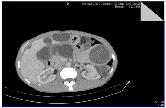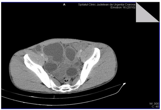 The definitive diagnosis of the retroperitoneal hydatid cyst was based on the anamnesis, clinical examination and paraclinical examinations, including serological examinations. The medical history of the patients was insignificant, but most of them were from rural areas and confirmed the close interaction with animals (sheep, goats, dogs). The clinical examination very rarely raises the suspicion of retroperitoneal hydatid cyst, the examinations of other systems and organs being normal. Most of the biological investigations were within normal limits. The serological examination by detecting the immunoglobulin G antibody by the ELISA method (enzyme-linked immunosorbent assay) was positive in all cases, showing high sensitivity and specificity and was only performed after raising the suspicion of hydatid cyst by imaging methods. Non-invasive imaging paraclinical investigations for the diagnosis of the disease were: abdominal (or regional) ultrasound, CT scan (computed tomography) and MRI (magnetic resonance imaging) that proved a high sensitivity. The presence of daughter cysts, hydatid sands, and floating membrane can confirm the diagnosis of hydatid cyst [6,7]. Abdominal ultrasound established the diagnosis in the case of 4 patients, and in the case of two patients it raised the suspicion of retroperitoneal hydatid cyst. The CT examination was carried out in 5 patients, for diagnostic purposes or for the remote evaluation of the lesions. In 2 patients, the tomographic diagnosis was accidental, without clinical or paraclinical suspicion of abdominal hydatid cysts and revealed their single or multiple presence, either only retroperitoneally or also intraperitoneally (Figure 2 and Figure 3).