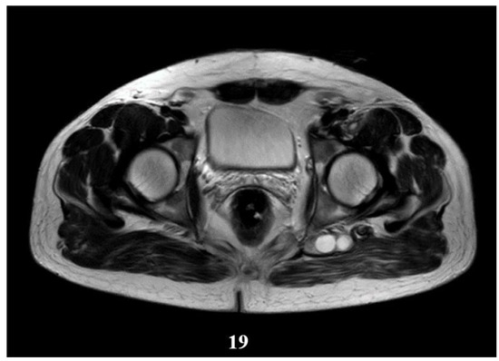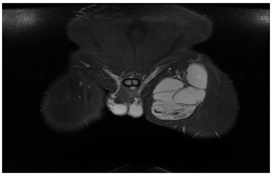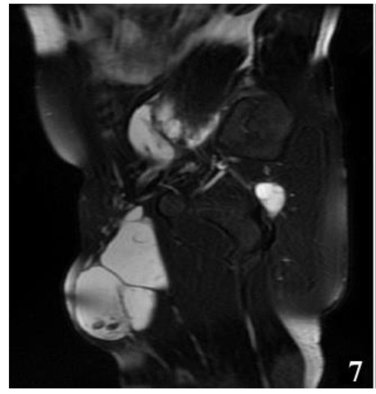 The MRI examination was performed on two patients for surgical purposes, to establish the relationship with other organs or vital structures and to guide the indication and the surgical plan. It is important to note the case of a 32-year-old male patient, hospitalized for the presence of a tumor formation at the base of the left thigh, in which the native and contrast enhanced MRI examination of the pelvis and thigh revealed: urinary bladder without parietal thickenings or endoluminal pathological processes; seminal vesicles without pathological signal changes; prostate measuring 4.7/3.2 cm, homogeneous, without pathological contrast plugs; without suspicious adenomegaly at the pelvic level; replacement process of polylobate space, which is relatively well demarcated, predominantly with fluid signal, multiple septate, without diffusion restriction, with gadophilia present at the peripheral and intralesional septal level, starting from the vicinity of the psoas and iliac muscle on the left side and extending into caudal direction through the anterior portion of the inguinofemoral region on the left side to the proximal region of the left thigh, and coming into contact with the common iliac, external iliac and femoral vessels on the left side (apparently with preserved flow at their level and with the apparently left femoral diaphysis but no macroscopic invasion phenomena at this level); previously described space-replacing process, which extends over a cranio-caudal distance of approximately 33 cm and shows inhomogeneous signal at the level of some of the intralesional cystic areas; deep to the gluteus maximus muscle on the left side, a relatively well-defined area can be seen, with a polylobate contour, multiple septa, with a similar appearance to the previously described space-replacing process, with dimensions of 2.9/2.75 cm—possibly parasitic cystic lesions (Figure 4, Figure 5, Figure 6, Figure 7, Figure 8 and Figure 9).