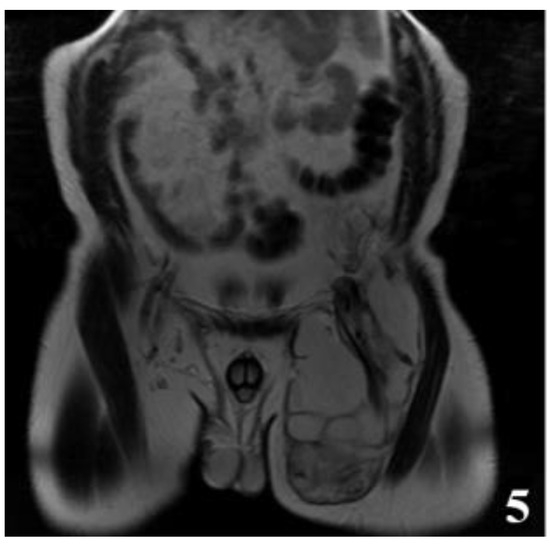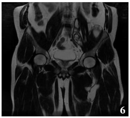 T2W MRI sequences, coronal—Hydatid cyst of left iliopsoas muscle and left thigh, with daughter cells and Serpent sign present [8] (part 2).