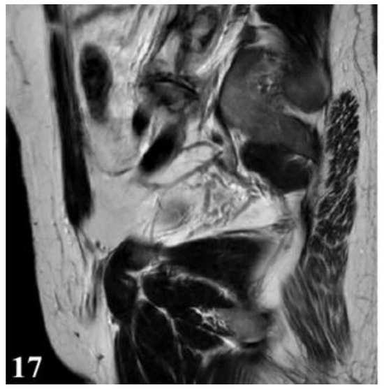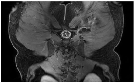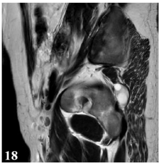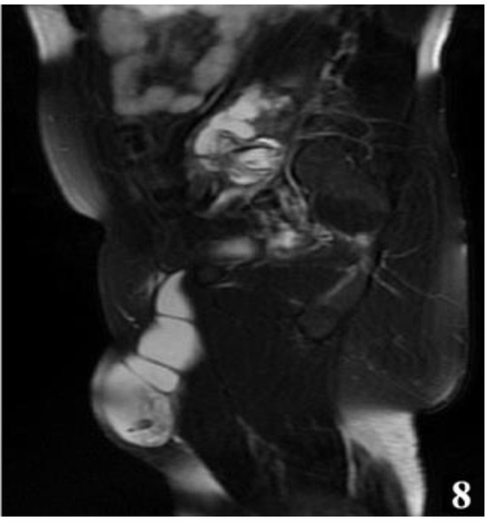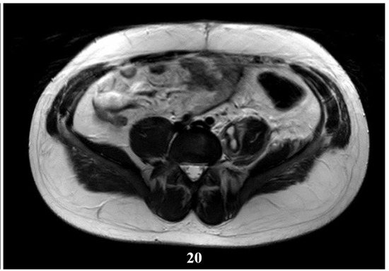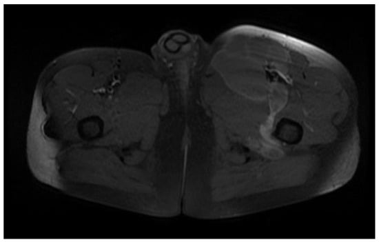 Considering the impossibility of performing an ideal cystectomy, it was decided to perform an efficient drainage by closing the remaining retroperitoneal cavity after mounting a drain tube (through which the lavage and drainage slope at the base of the left thigh with tubes passed through the muscle gap is carried out). Adjacent peritoneal drainage and anatomical parietorrhaphy. Native MRI examination and post-operative intravenous post-contrast (Figure 17 and Figure 18), reveals: diffuse infiltrative-edematous appearance at the level of the iliopsoas muscle on the left side, with the presence of a collection with peripheral type gadophilia, difficult to appreciate under dimensional ratio, with a tendency to diffuse extension, developed predominantly intramuscularly at the level of the psoas muscle on the left side, with the predominant interest of its peripheral portion between 7–3 o’clock (being tangent to the external iliac vessels on the left side, with present, homogeneous flow at their level), extended to at the level of the ipsilateral iliac muscle and later in a caudal direction at the level of the iliopsoas muscle on the left side up to the vicinity of its distal insertion, after which it insinuates between the muscles of the antero-internal region of the thigh on the left side up to the border between the proximal third and the middle third of the thigh, and coming into contact on several sections with the femoral vessels on the left side, but without causing changes in caliber or flow at their level. At the level of the proximal portion there is a fistulous tract with a maximum thickness of approximately 0.7 cm, externalized at the level of the root of the left thigh in the antero-internal region which seems to communicate in depth with the previously described collection. In the proximal portion of the thigh on the left side, diffuse infiltrative-edematous changes adjacent to the previously described collection are evident at the level of the intermuscular space in the anterior region of the thigh, without being accompanied by similar changes at the level of the muscles in the anterior region of the thigh (Figure 17 and Figure 18).